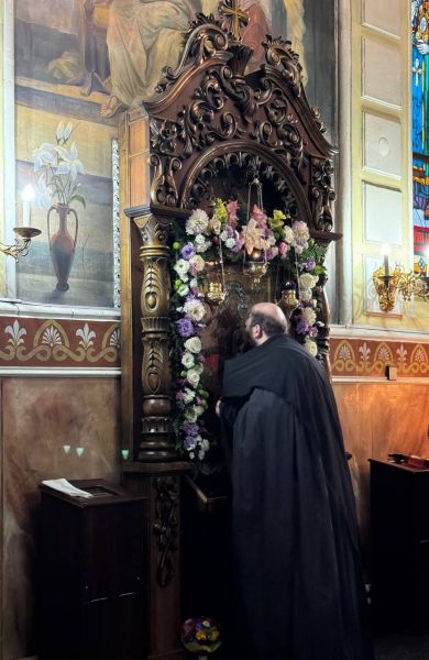 Увечері 29 серпня братією монастиря було звершено Вечірнє богослужіння з чином погребіння плащаниці Пресвятої Владичиці нашої Богородиці та Приснодіви Марії. Прославлення Божої Матері займає особливе місце в богослужіння Православної Церкви. В дні свята Успіння Пресвятої Владичиці нашої Богородиці і Приснодіви Марії у багатьох храмах нашої Церкви звершується служба Єрусалимської Утрені із чином Погребіння Плащаниці Пресвятої Богородиці. Це богослужіння відправляється на зразок Єрусалимської Утрені Великої Суботи, і його головну частину становить 17-та кафізма із особливими приспівами, або Непорочні із Похвалами. Саме це богослужіння складається із Великої Вечірні та Єрусалимської Утрені. Під час Утрені, після співу особливих тропарів на прославлення Пресвятої Богородиці, священнослужителі виходять на середину храму до Плащаниці Богородиці, де власне читаються Непорочні з Похвалами. Згідно благочестивої традиції, в цей час священнослужителі і вірні тримають у руках запалені свічі.Під час співу Великого Славослів’я священнослужителі знову вийшли до Святої Плащаниці, вшанувавши її кадінням та звершивши разом із вірянами три земних поклони. Після чого Плащаниця, під спів поховального «Святий Боже», була хресним ходом обнесена навколо храму.Варто зауважити, що богослужіння Погребіння Плащаниці Пресвятої Богородиці особливо урочисто відправляється у Святому Граді Єрусалимі, у Гефсиманії, на місці ймовірного поховання Матері Божої.